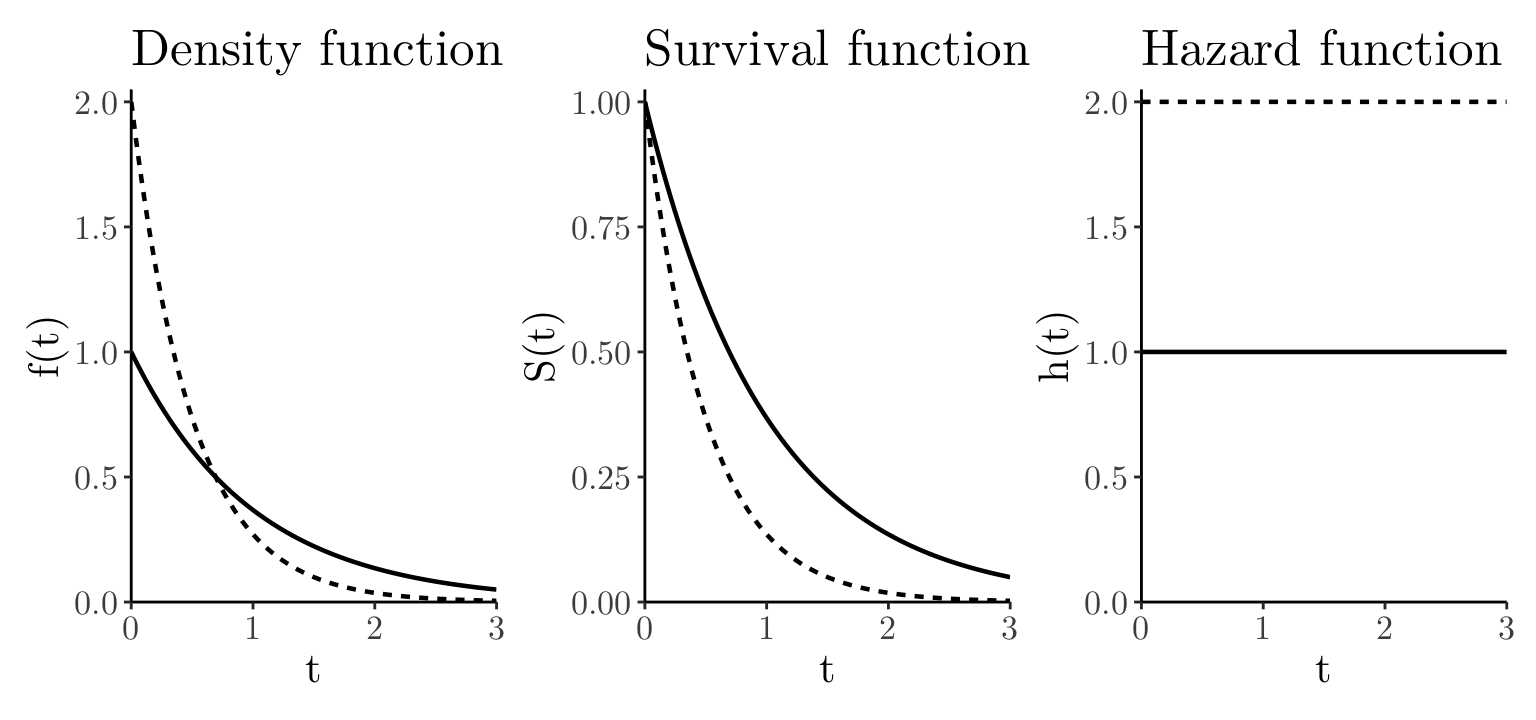 p2 <- ggplot(df_combined, aes(x = t, y = St, linetype = sigma_factor)) + geom_line(linewidth = 0.8) + labs(x = "t", y = "S(t)", title = "Survival function") + shared_linetype + scale_x_continuous(limits = c(0, 5), expand = expansion(mult = c(0, 0))) + scale_y_continuous(limits = c(0, 1.05), expand = expansion(mult = c(0, 0))) + custom_theme + theme(legend.position = "none")