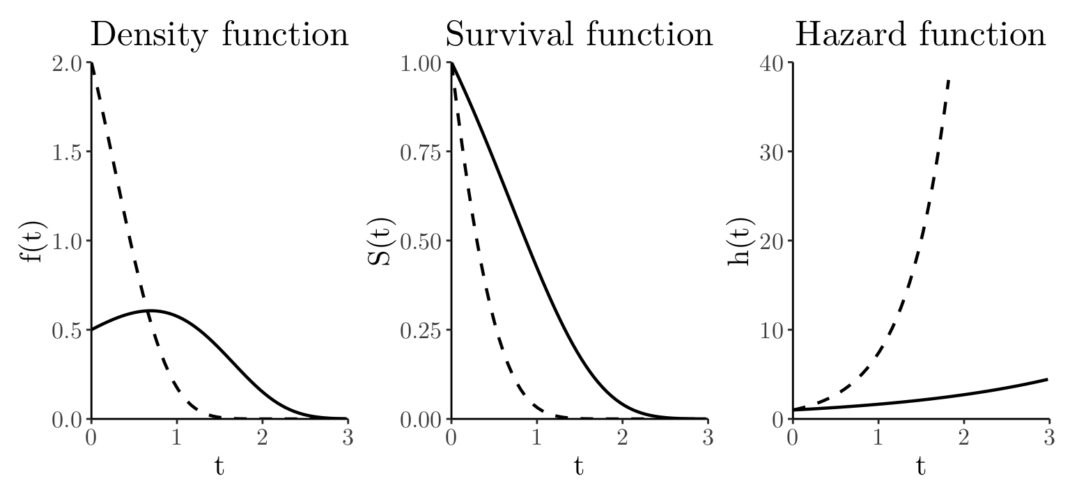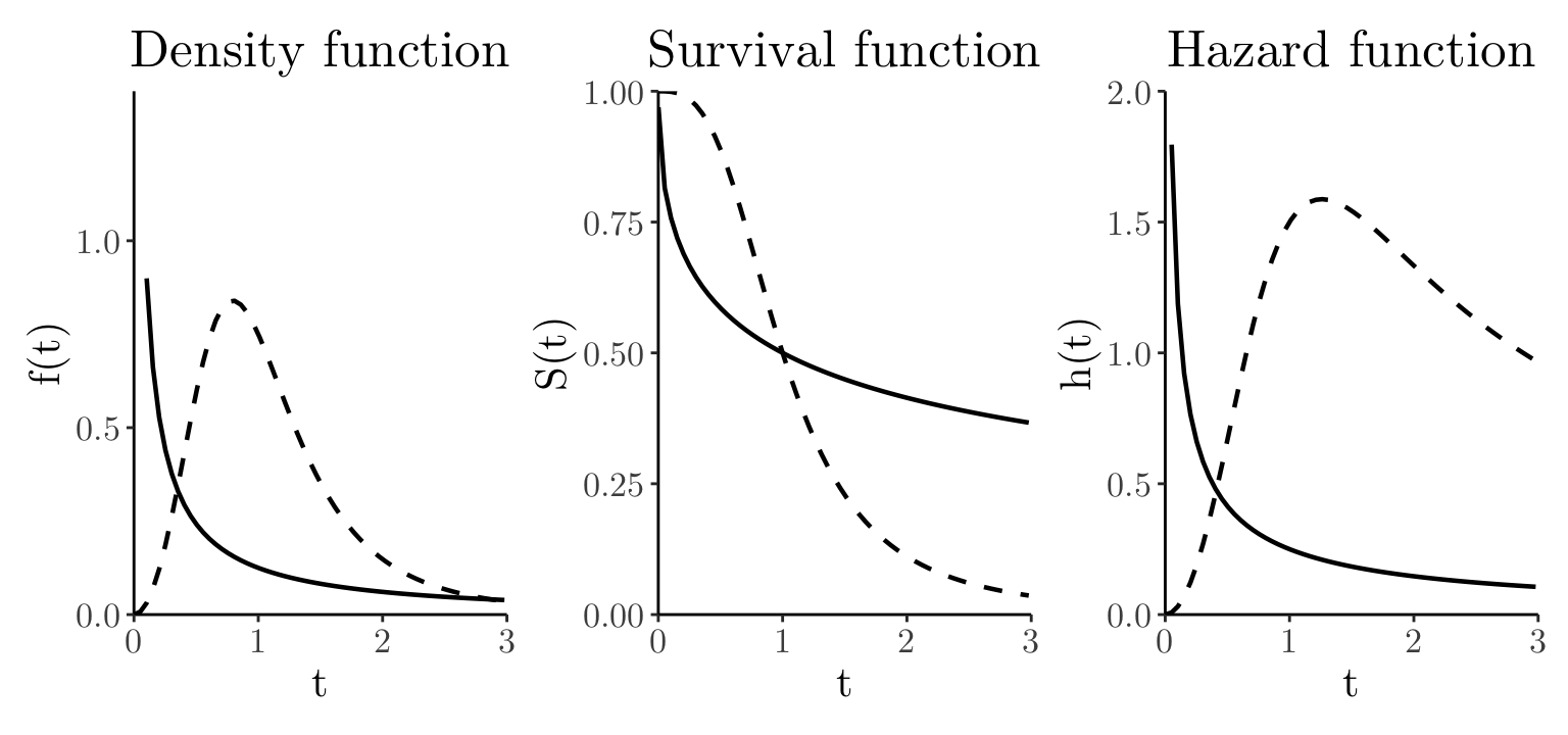 p1 <- ggplot(df_combined, aes(x = t, y = ft, linetype = sigma_factor)) + geom_line(linewidth = 0.8) + labs(x = "t", y = "f(t)", title = "Density function" ) + shared_linetype + scale_x_continuous(limits = c(0, 5), expand = expansion(mult = c(0, 0))) + scale_y_continuous(limits = c(0, 1.55), expand = expansion(mult = c(0, 0))) + custom_theme + theme(legend.position = "none")