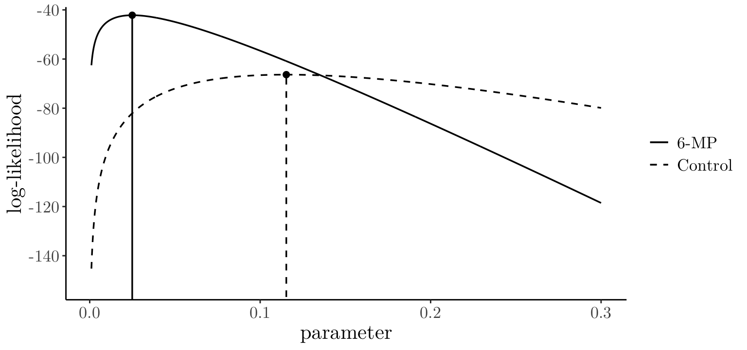 control groupThe plot below shows the log-likelihood curves for both groups (6-MP and control).