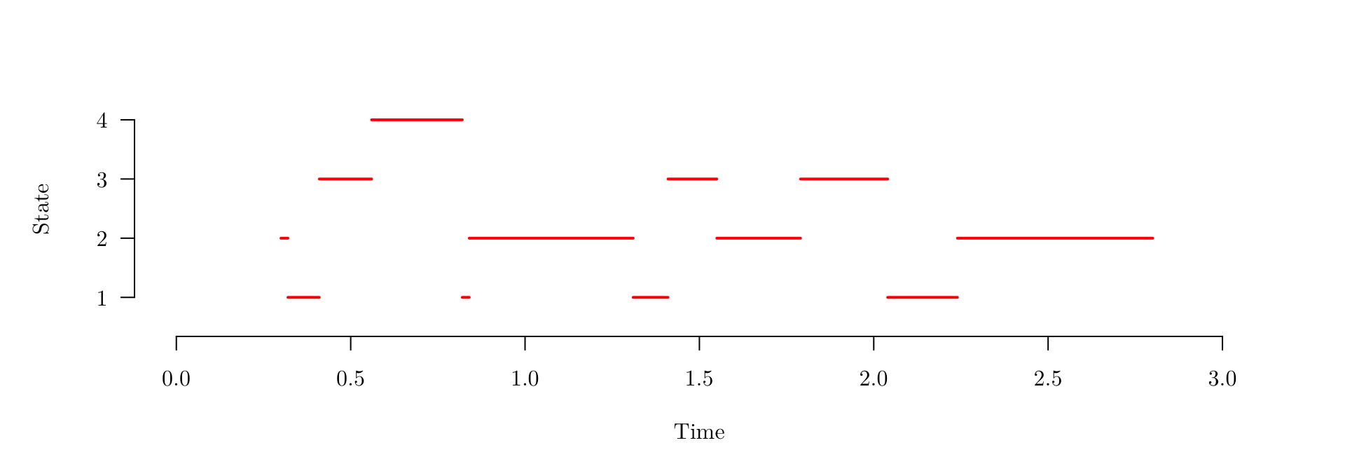 \[ \begin{eqnarray*} L(\boldsymbol{\mu})&=&f_{y_0}(t_1-t_0)p(y_1|y_0)\;\times\; f_{y_1}(t_2-t_1)p(y_2|y_1)\; \times\;\cdots\\ &&\qquad \times\; f_{y_{J-1}}(t_{J}-t_{J-1})p(y_J|y_{J-1})\;\times\; S_{y_{J}}(t_{J+1}-t_{J})\\ &=& S_{y_{J}}(t_{J+1}-t_{J}) \prod_{j=1}^J f_{y_{j-1}}(t_{j}-t_{j-1}) \cdot p(y_j|y_{j-1}), \end{eqnarray*} \] where \[ f_k(t)=\sum_{\ell\ne k} \mu_{k\ell}\exp\left(-t \sum_{\ell\ne k} \mu_{k\ell}\right), \] \[ S_k(t)=\exp\left(-t \sum_{\ell\ne k} \mu_{k\ell}\right), ~~~~\text{and} \] \[ p(\ell|k)=\frac{\mu_{k\ell}}{\sum_{\ell\ne k} \mu_{k\ell}}. \]