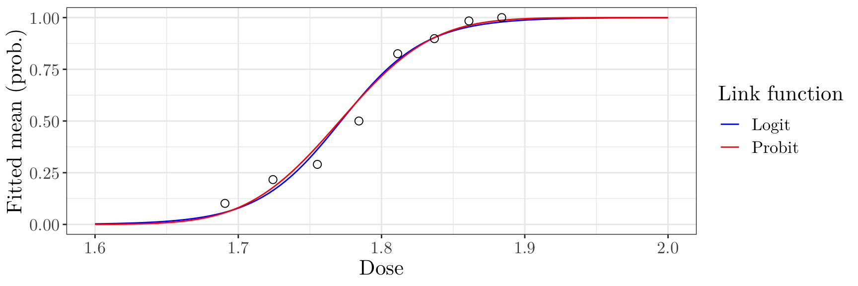 Recall that, for the Bernoulli distribution (previous lecture), \[ b(p) = \log(1 + \exp p) \] Thus, the canonical link is \[\begin{align*} \frac{d}{dp}b(p) = b'(p) &= \frac{\exp p}{1 + \exp p} \\ \mu &= \frac{\exp p}{1 + \exp p} \implies p = \log\left(\frac{\mu}{1 - \mu}\right) = \text{logit}(\mu), \end{align*}\] i.e., the canonical link function for this example is \(g(\mu) = \text{logit}(\mu)\).