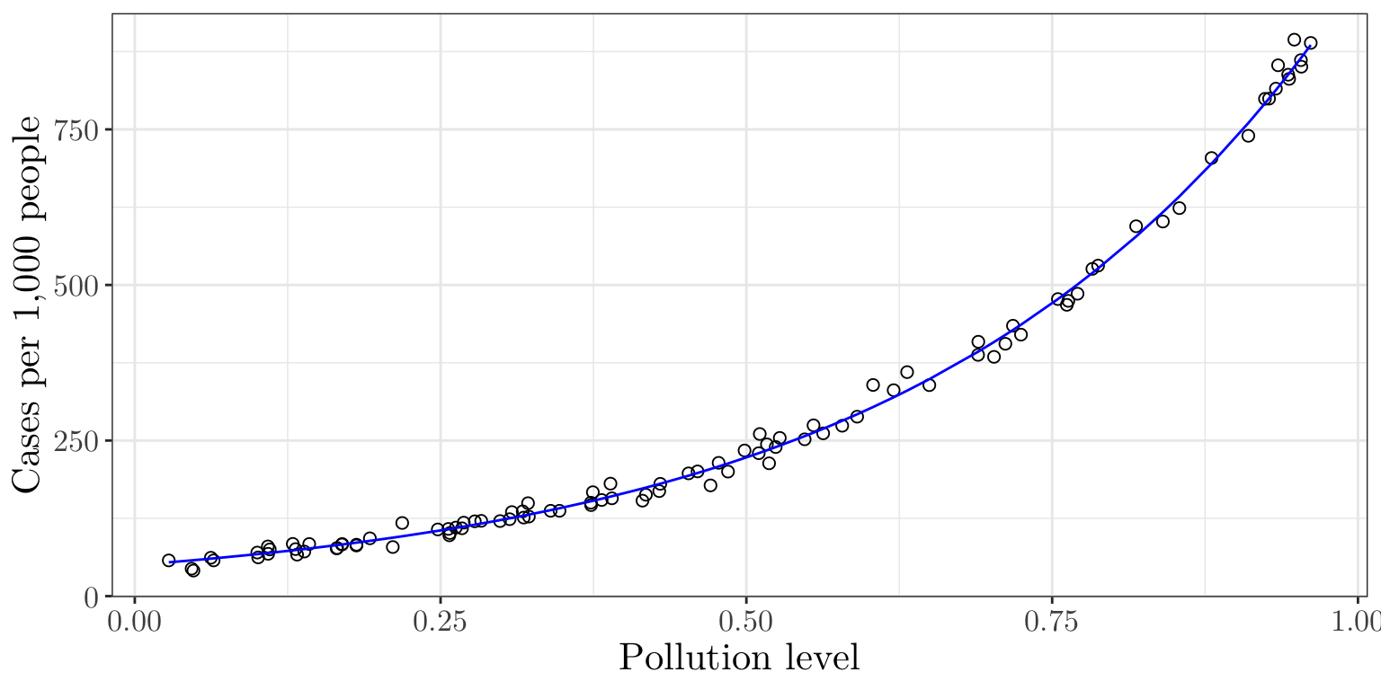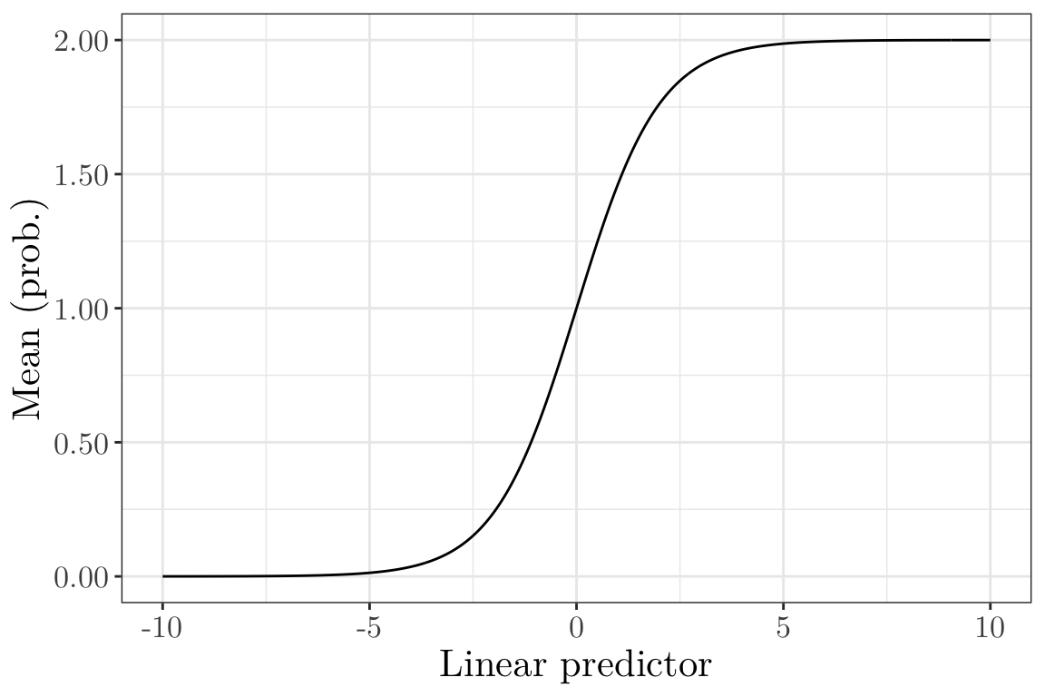 To complete the specification of a generalised linear model, we will need to model how the parameters of the response distribution (e.g. the success probability \(p_i\) or the rate \(\lambda_i\)) depend on explanatory variables \(x_i\). We need to do this in a way which respects constraints on the possible values which these parameters may take; for instance, we should not model \(p_i = x_i^{\top} \beta\) directly, as we need to enforce \(p_i \in [0, 1]\).