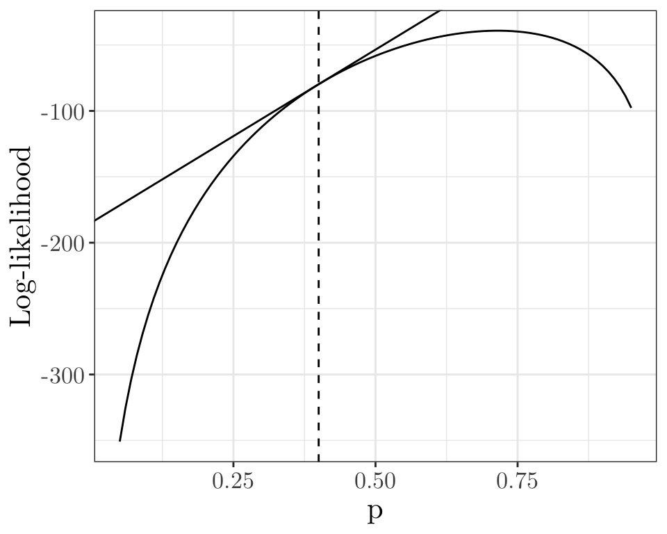 Recall we are assuming \(a(\phi_i) = \sigma^2/ m_i\), so \(\text{Var}(Y_i) = V(\mu_i) \sigma^2 / m_i\). So \[ u_k(\hat{\boldsymbol{\beta}}) = \sum_{i=1}^n \frac{m_i(y_i-\hat \mu_i)}{V(\hat \mu_i) \sigma^2} \cdot {{x_{ik}}\over{g'(\hat \mu_i)}} = 0, \] and multiplying through by \(\sigma^2\), we obtain \[ u_k(\hat{\boldsymbol{\beta}}) = \sum_{i=1}^n \frac{m_i(y_i-\hat \mu_i)}{V(\hat \mu_i)} \cdot {{x_{ik}}\over{g'(\hat \mu_i)}} = 0, \quad k = 1, \cdots, p, \] which we can solve numerically (e.g., via Iteratively Reweighted Least Squares) without ever specifying or estimating \(\sigma^2\).